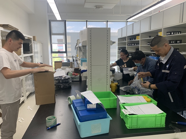 國合通測生產(chǎn)運營部員工正在忙碌地打包產(chǎn)品,確??蛻艄?jié)后第一天能順利收到貨物