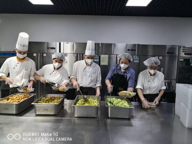 有研興友餐飲工作人員正在分裝職工晚餐